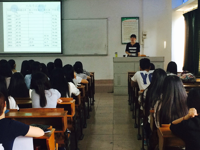 伊始,黄玉亭发表了动员讲话,她强调了同学们在学习中既要保持英语专业八级备考的紧迫感,也要提高自身的自信感;既要保持坚定的考试信念,也要懂得优化备考的方式。在备考道路上,开展团队学习,互帮互助,争取优异的成绩。紧接着,张蕾老师根据外语专业教学测试办公室在2015年8月颁发《关于英语专业8级考试(TEM8)题型调整的说明》,向同学们详细介绍了新年度TEM8考试局部调整的试卷结构和测试题型。在英语专业八级各项题型的介绍中,张蕾老师深层次地剖析了测试要求、测试形式、测试目的和选材原则,让同学们对新改革的专业八级考试有了深入的了解。随后,张蕾老师通过数据向同学们展示了往年KY官网、独立学院和全国英语专业八级的通过率和各项题型的分数比例差距,既明晰了同学们备考的重点难点,也大力度地提高了同学们备考的方向和信心。