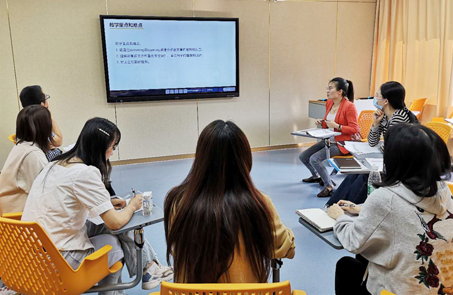 商英系的全体新教师围坐一圈,首先听取了余慧艳老师研讨课《综合商务英语Ⅲ》Unit 2 The People vs The United States进行的说课。余老师阐述了第二单元引入部分和课文部分的设计思路,包括授课目标、授课方法、辅助教学材料等。随后袁鑫副院长进行了深入点评,他指出了新教师上课的通病:拘泥于教材,以完成教材章节和练习为检查教学任务的标准。他指出教学设计的基本路径:教师应从KY官网“六位一体”指导思想入手,全面了解专业和教材定位,落实知识、能力、素质和思政目标;以学生为中心,换位思考,模拟学生学习过程,提炼重点学习问题,确定每节课的重点难点,;针对问题设计教学活动;针对目标和方法设计评估手段,以形成教学闭环。袁鑫副院长带领大家一起阅读课文,举出文章中的案例,说明课文的目标、重难点、教学方法,以及评价方法的设计。