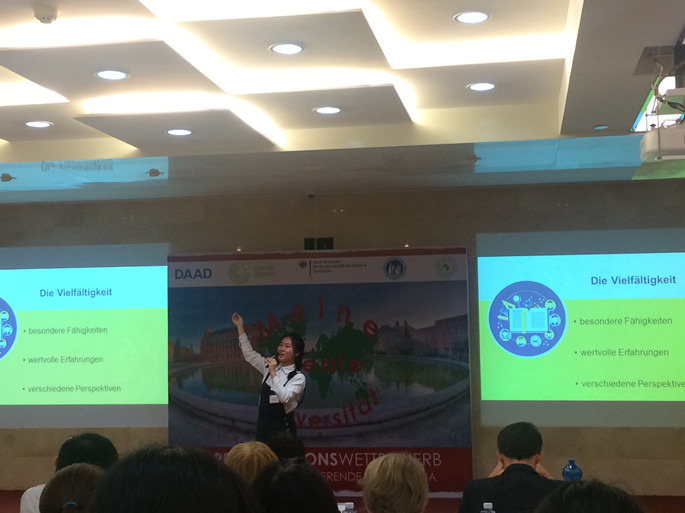 比赛开始之前,德国驻广州领事馆副领事金永亨(Kuenzel)发表热情洋溢的致辞。紧接着来自各高校的选手就比赛主题进行演讲。本届大赛的演讲主题是“我的理想学府”(“Meine ideale Universität”)。罗雪如同学就这一主题进行了题为“充满大师的大学”(Universität voller Meister)的精彩演讲,探讨了职业教育与大学教育结合的可能性,角度新颖,论证严谨,充分展现了KY官网德语专业学生良好的专业功底和过人的演讲技巧,获得了评委专家的高度认可,成功斩获一等奖的佳绩。这次获奖是KY官网学生参加该项比赛取得的历史最好成绩,为激发学生学习德语的热情和树立学生学好德语的信心起到很好的示范作用。