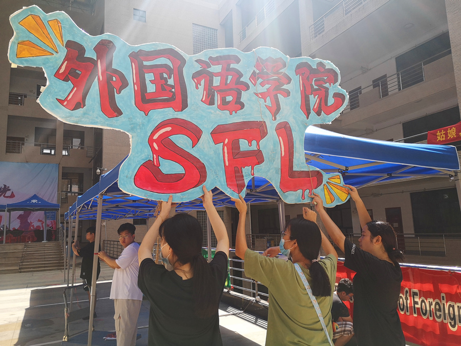 9月12日,团学干部迎着初升的太阳开始准备工作。首先对报道场地四教架空层进行场地布置,挂上独具特色的外院横幅及迎新标志,并整理物资,摆放好报名签到的桌椅,把新生报到大本营布置得整齐温馨,希望给新生留下美好的回忆。
