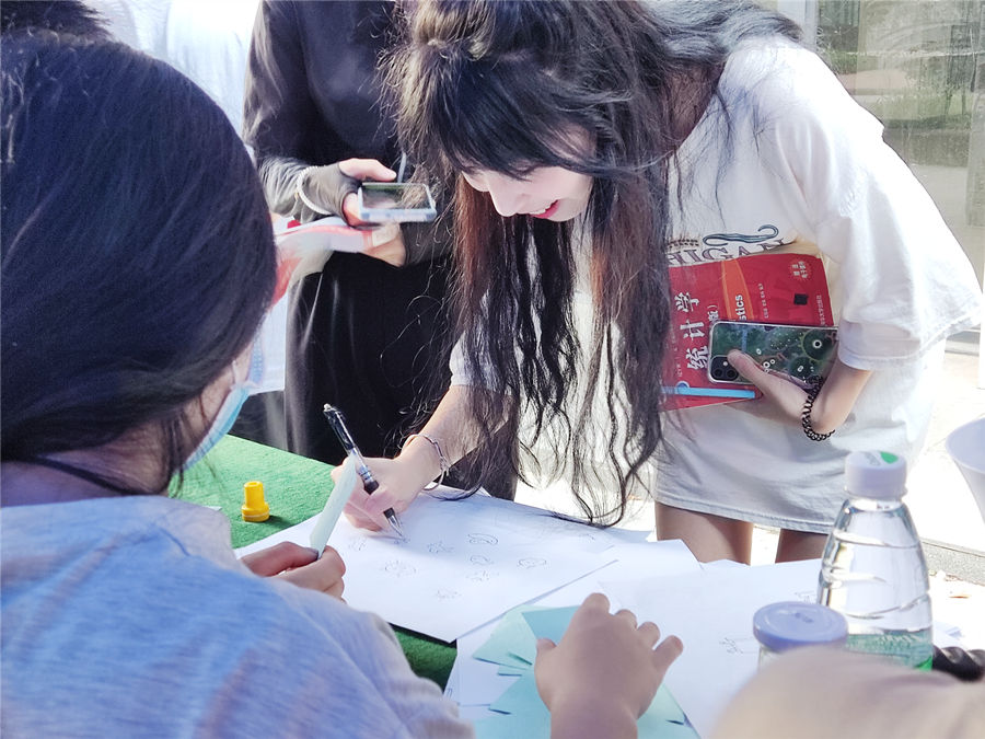 经过工作人员紧张的筹备,活动于2021年5月25日9:00准时开始。本次系列活动主要有四项内容。一是“心理辅导站,你我心相连”,即随机抽取纸条,回答问题,题目涉及心理辅导站和心理健康的相关知识;二是天天向上手势舞,同学们跟着做出视频里的动作,视频为综艺节目《天天向上》主题曲的手势舞;三是歌曲飞花令,即随机抽取一个字,然后唱出带有这个字的五句歌词;四是画一画,参与者随机抽取一张简笔画,用15秒以内的时间看图画上的内容,然后将卡片交给工作人员,自行完成绘画。获得两个学院章便可以盖一个校集章卡上的院章,还能参与抽奖。