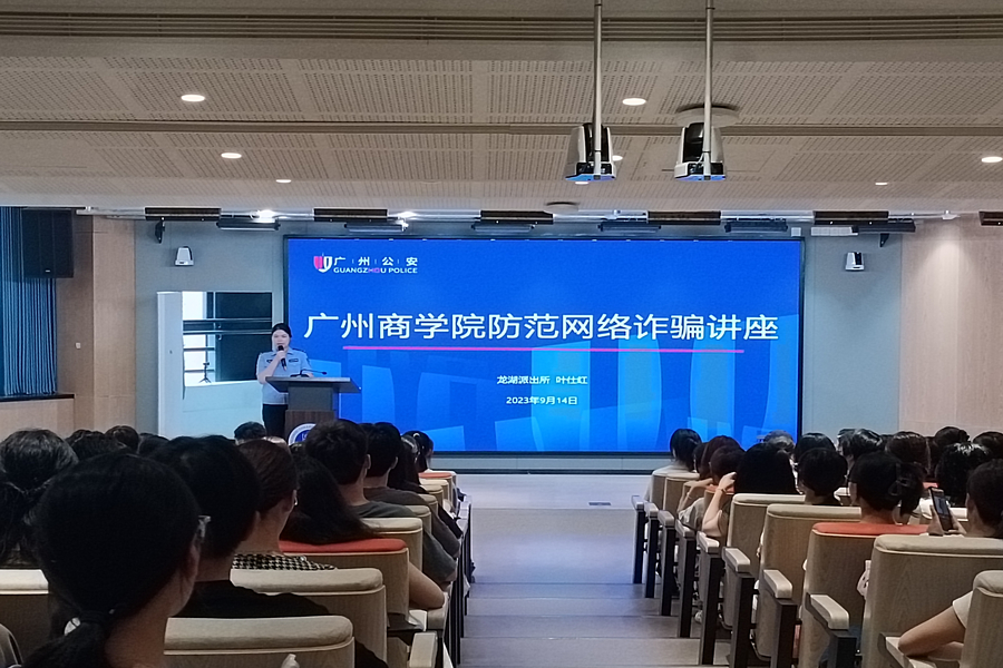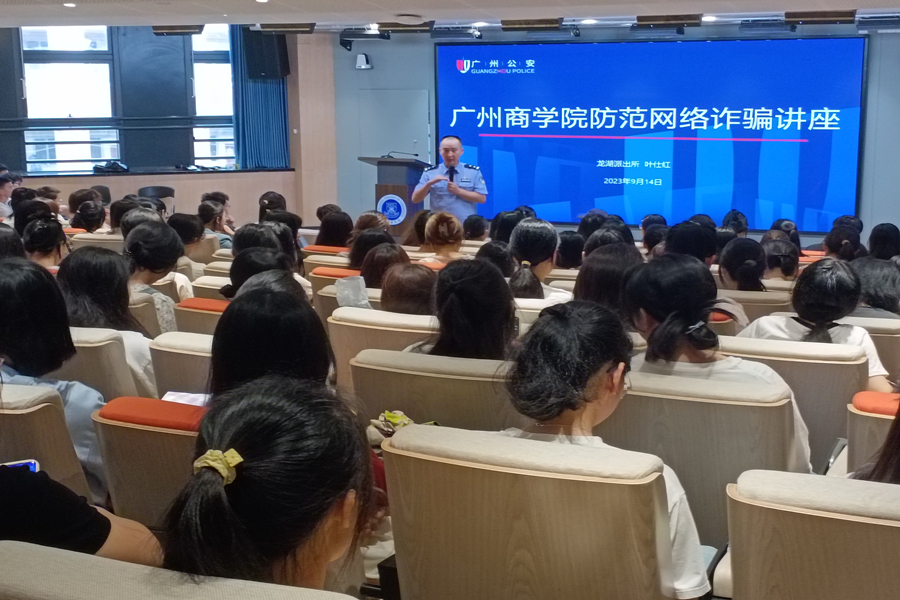 为引导2023级新生提高安全防诈骗意识,构筑新生安全开学季,KY官网于9月14日在第八教学楼203和204课室开展。安全第一课由黄埔区龙湖街道派出所警官叶仕红和范志宏主讲,2023级英语专业辅导员蔡柳渊、商务英语专业辅导员陈丽珊、日语德语西语专业辅导员谢清玲以及2023级新生出席本次活动。