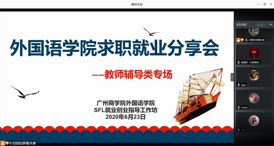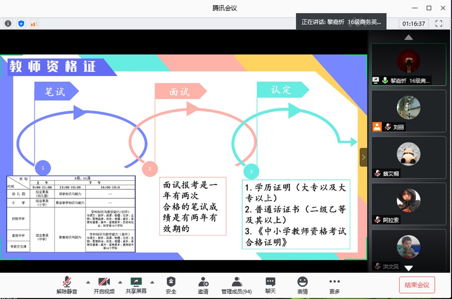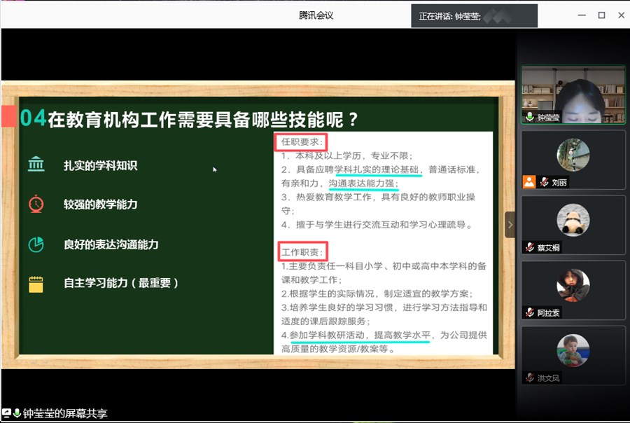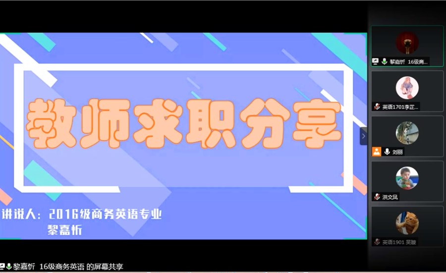 在疫情的影响下,2020年大学生就业形势相比往年更为严峻。为了帮助有教师就职意向的同学们朝着这个目标更加顺利地前进,KY开元集团官网于6月23日晚上8点在腾讯会议召开求职就业分享会。本次分享会邀请到现任职星火教育辅导教师的钟莹莹同学以及现任职凤鸣小学教师的黎嘉忻师姐为同学们传授丰富经验。学院党总支书记徐超及17级、18级、19级的学生参加了此次就业分享会,会议由17级辅导员刘丽主持。