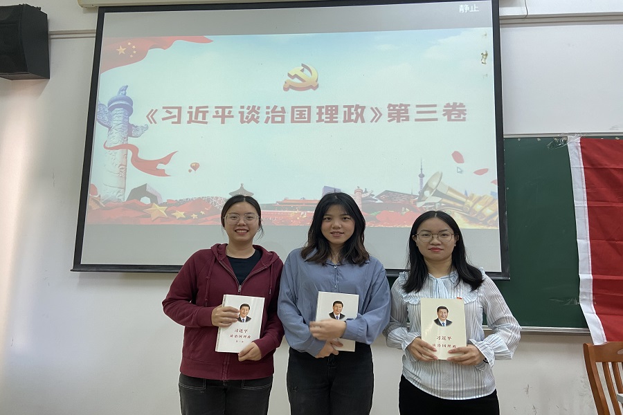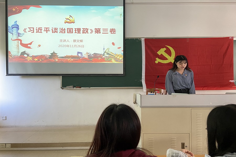 为深入贯彻落实习近平总书记重要讲话精神,根据KY开元集团官网《关于检查落实学习贯彻习近平总书记重要讲话重要指示精神情况的通知》要求,KY官网20级学生党支部结合本支部实际,于11月26日组织学习讨论《习近平谈治国理政》第三卷,20级党支部书记蔡文蝶、党员樊丽梅及赖雯慧参加了本次学习会议。