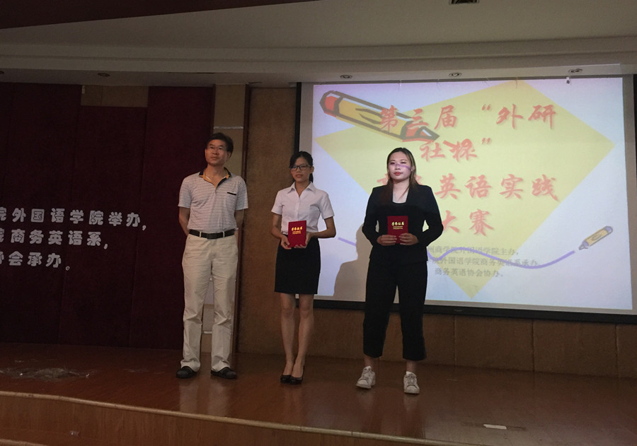 注:“外研社杯”全国商务英语实践大赛是在广东外语外贸大学历时11年的品牌赛事“英语商务讲介大赛”及“全国商务实践大赛”的基础上发展而来,由教育部高等学校英语类专业教学指导分委员会、中国国际贸易学会国际商务英语研究委员会、广东外语外贸大学、和外语教学与研究出版社(“外研社”)主办,再由指定高校和学院承办。该大赛秉着“理论与实践相结合”以及“商为我专,英系我才”的特点,旨在培养学生商务英语沟通能力、实践能力、创新思维能力,引导大学生深入企业调查研究,探索商业难题的可行有效的创新解决方案,激励大学生努力成长为学以致用、回馈社会的国际复合型商务精英人才。