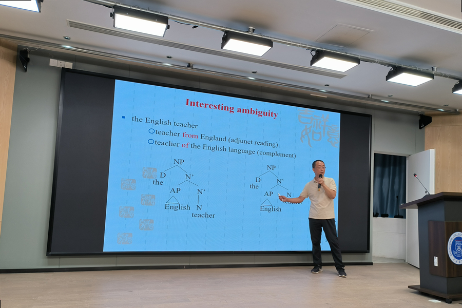 广东外语外贸大学韩景泉教授作《名词组的三层次结构分析法》的报告。韩景泉是国际著名的理论语言学家、句法学家,他通过句法实例为大家剖析了科研落脚点。在日常教学中,他会强调句子诸如“the student of Physics with long hair from London”的顺序,后置定语顺序打乱,句子不通顺则不被接受。一般的语法教学可能就止步于此,而科研的任务就是要找到后置定语不能调换顺序的原因。通过引入X’ structure等树状图,他解释了句子的深层结构,不同层次结构的后置定语是不能混淆顺序的,不然就会被认为是错误的句子。韩景泉深入浅出,分享了句法分析的纯粹之美,令大家深刻理解了以小见大的科研之法。