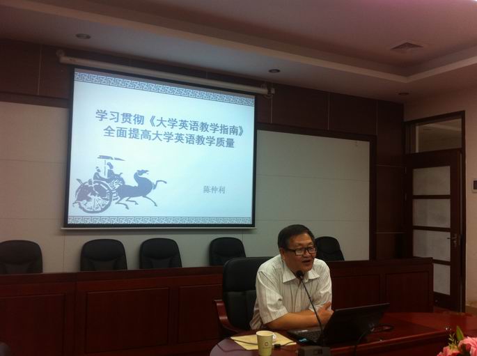 针对英语专业的人才培养问题,陈教授介绍了他的 “三主一体化”的教学理念。这种教学理念改变了传统教学“满堂灌”和“一言堂”的教学模式,而转为教师指导和启发下的学生自主学习。以该理念为指导,陈教 授向在座的老师们展示了他在燕京理工学院开展了“5651工程”建设的主要内容以及所取得的效果和成绩,全体老师赞叹不已。