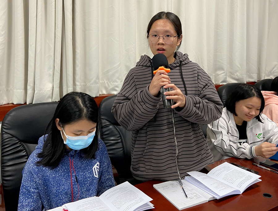 谢清玲总结发言,今天距离党的百年华诞还剩100天,同时距离本校合格评估仅剩18天,在座的各位入党积极分子作为青年学生中的骨干力量,在这个关键时刻更要以正式党员的高标准严格要求自己,在生活上和课堂上起到引领作用,以饱满的热情、积极的姿态和高度的责任感,携手广大同学一起认真学习评估相关知识,积极参与各类活动,用实际行动为顺利完成学校评估工作保驾护航。
