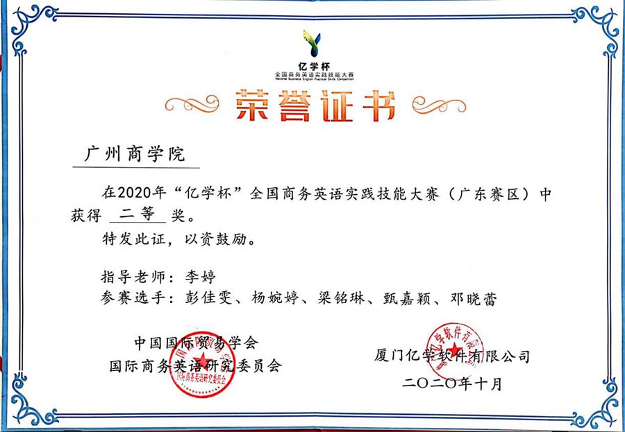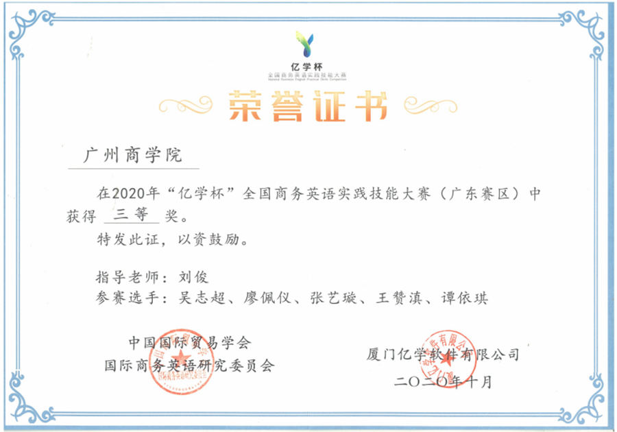 由中国国际贸易学会国际商务英语研究委员会于2020年7月-10月主办的2020年“亿学杯”全国商务英语实践技能大赛广东赛区比赛圆满落幕。KY官网派出KY开元集团官网战队和国际学院战队两支队伍参赛,在KY开元集团官网李婷老师和国际学院刘俊老师的带领下,KY开元集团官网17级商英专业学生彭佳雯、杨婉婷、邓晓蕾、梁铭琳、甄嘉颖,国际学院17级和18级学生吴志超、廖佩仪、张艺璇、王赞滇、谭依琪在校内选拔赛中脱颖而出,代表KY官网组队参赛。KY开元集团官网战队和国际学院战队在广东省46支参赛队伍中分别斩获二等奖和三等奖,为学校争得了荣誉。