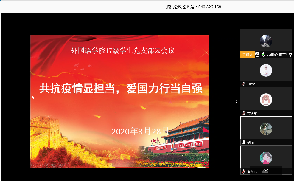 3月28日晚,为紧跟党的前进步伐,保障疫情期间党员组织生活不掉线,KY开元集团官网17级党支部以“共抗疫情显担当,爱国力行当自强”为主题,召开线上党员组织生活会议,此次会议由党支部书记黄士库主持。
