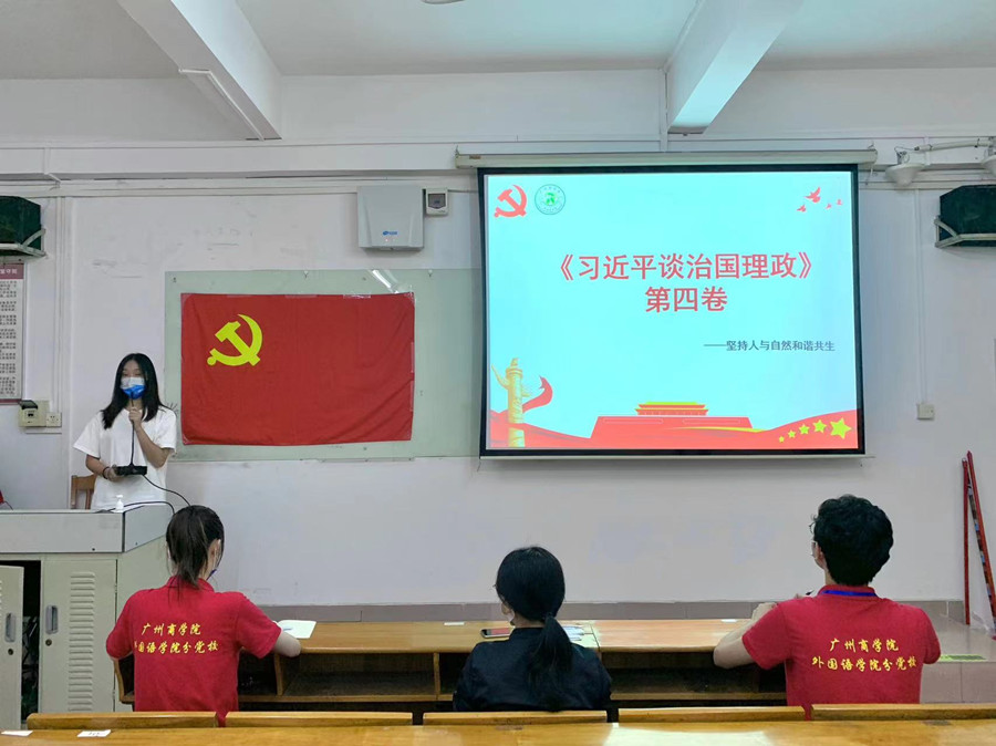 七组代表依次上台分享各自组员们对《习近平谈治国理政》第四卷的所学、所思、所感。听党指挥队围绕第七专题把握新发展阶段,贯彻新发展理念,构建新发展格局浅谈“三个把握”,即从根本宗旨、问题导向、忧患意识把握新发展理念;强国队围绕坚持走中国特色强国之路,以视频方式引出小组感想,提到强国必须强军,军强才能国安;圆梦队以保障和改善民生为重点加强社会建设展开探讨,以苏炳添、朱婷等体育健儿们为例提到新时代青年应踔厉奋发、笃行不怠;我心向党队围绕第十四专题坚持人与自然和谐共生展开探讨,他们指出,本次新型冠状病毒疫情让我们重新审视人与自然的关系,对大自然我们要心存感激,要坚持在保护中发展、在发展中保护。