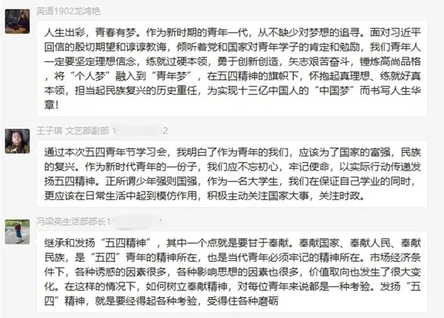 习近平总书记说:“青春因磨砺而出彩,人生因奋斗而升华。”新时代的青年学生,要以五四精神为指引,珍惜新时代带给我们的人生际遇,在继承和弘扬五四精神基础上,用实际行动诠释新时代五四精神的生动内涵,自觉地肩负起实现中华民族振兴和国家富强的使命担当,时刻铭记着,无奋斗,不青春,用奋斗让五彩的青春焕发光彩!