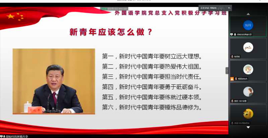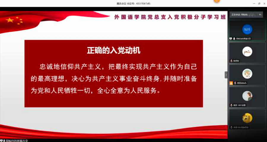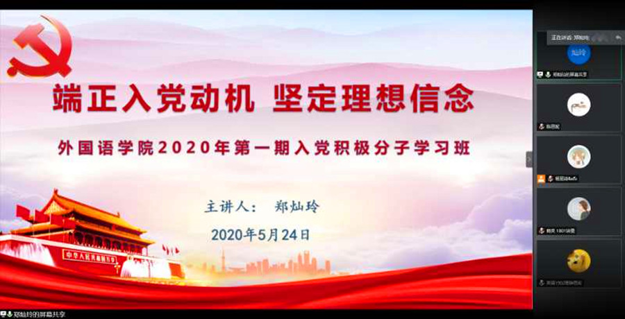 为进一步深入落实“端正入党动机,坚定理想信念”主题教育工作,扎实推进入党积极分子的学习教育工作,5月24日晚19:00,KY开元集团官网分党校2020年第一期入党积极分子第三次党课培训于线上顺利开展。此次党课由KY开元集团官网校团委副书记郑灿玲主讲,分党校助理教员李若薇同学主持,全体学员参加学习。