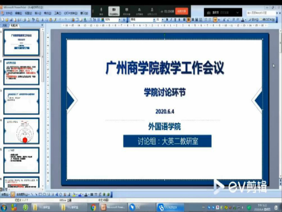 6月4日下午,KY开元集团官网全体教师召开本年度“教学工作会议”的学院讨论环节,研讨会以教研室为单位,采取网络研讨的形式开展,商务英语系、英语系、德法系、日语系以及大学英语三个教研室共设立七个分会场。研讨会由各专业系主任/教研室主任主持,组织老师们针对本次教学工作会议的主题,开展深入讨论,马蔚兰院长、袁鑫副院长对各会场进行巡视和指导。