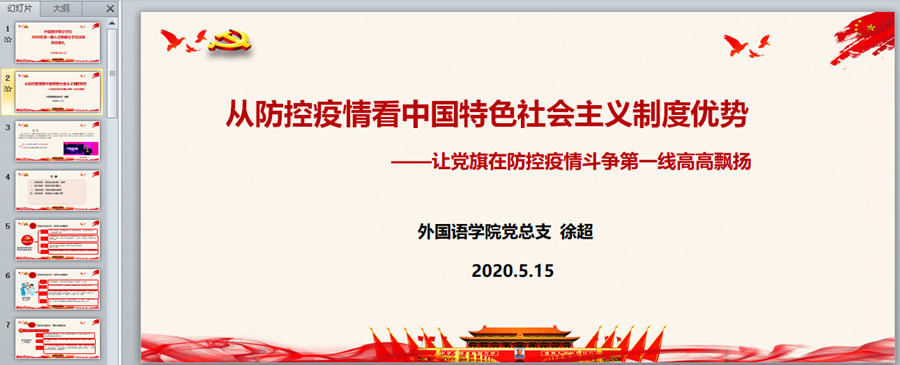徐超紧紧围绕“从防控疫情看中国特色社会主义制度优势”开讲第一课。他从中国共产党的体制优势、组织优势、制度优势及政治优势四个方面全面讲解了中国特色社会主义制度的先进性和优越性,深刻阐述了中国共产党的领导在全民共同抗击疫情,坚决打赢疫情防控阻击战的重要性和必要性。他深度融合新时代思想和大学生生活实践,通过一个个鲜活的事例用深入浅出的方法向学员分析疫情当前大学生学习习近平总书记对“90后”党员的回信精神、勇担时代责任的现实做法,进一步倡导入党积极分子要热爱祖国、拥护中国共产党的领导、热爱社会主义,增强了入党积极分子对国家和人民的强烈责任感和勇于担当的精神。最后,徐超还要求学员们一定要树牢“四个意识”、坚定“四个自信”,坚决做到“两个维护”,让党旗在防控疫情斗争第一线高高飘扬。