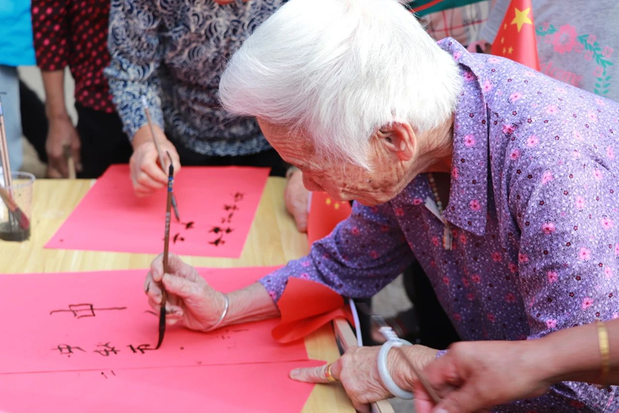 活动开始前,志愿者们有条不絮地布置活动现场,为接下来的志愿服务活动做好充足的准备。活动之际,志愿者们同社工一起带领老人们做拍拍操、猜灯谜等游戏,并为老人分发书法的材料和工具,悉心教导老人书写。