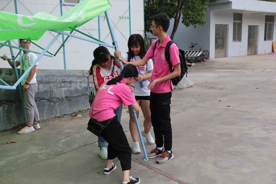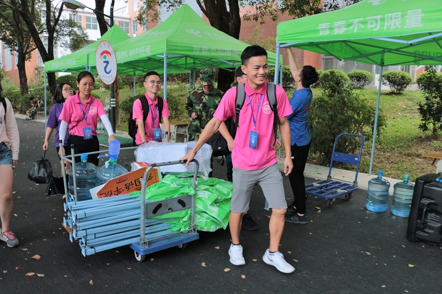 尽管每天起早贪黑,但每一位“小粉人”都任劳任怨,只为给新生做好后勤保障工作,他们在用自己的行动告诉18级新生:风里雨里,“小粉人”一直和你在一起!