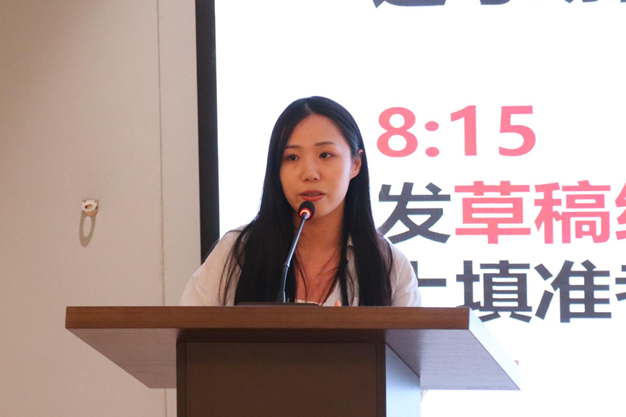 秦思莹从考试介绍、考试流程及考试策略三个方面进行分享。她提醒同学们应养成良好的习惯,填写答题卡时需准确填写个人信息并强调了答题卡的查收时间。秦思莹针对听力、阅读给出了相应的做题方法,并向同学们推荐了一些利于备战专四的读物。陈家怡从语法与词汇,完型填空,阅读与写作三个方面进行了经验分享。她建议我们准备单词本利用闲暇时间温故而知新并熟练掌握基本语法知识,总结了完型填空的做题步骤和方法,强调了阅读的复盘和写作的结构。此外,同学们要重视词汇的积累,合理规划时间进行备考。