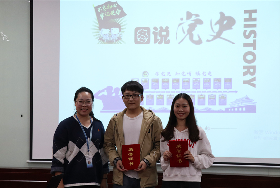周晓敏同志以1921年浙江嘉兴南湖的那艘“红船”为切入点,介绍了中国共产党的诞生,从此在中国出现了一个完全崭新的,以马克思列宁主义为其行动指南的,统一的无产阶级政党,中国的革命从此焕然一新。黄韵婷同志解说的图片主题为1923年 “中共三大”,她向与会的成员介绍了中共三大召开的背景及意义,本次会议促进了第一次国共合作的实现,使共产党活动的政治舞台迅速扩大,加速了中国革命的步伐,为波澜壮阔的第一次大革命作了准备。方梓满、蔡诗雯和刘建兴同志以1935年召开的遵义会议为主题,介绍了在红军第五次反"围剿"失败和长征初期严重受挫的情况下,为了纠正博古"左"倾领导在军事指挥上的错误而召开的。这次会议是中国共产党第一次独立自主地运用马克思列宁主义基本原理解决问题的路线、方针政策的会议;也正是在这次会议上确立以毛泽东为代表的马克思列宁主义的正确路线在中共中央的领导地位,挽救了党、挽救了红军、挽救了中国革命,是中国共产党历史上一个生死攸关的转折点。钟何丹云同志以南京解放,占领总统府为中心,介绍1949年我军乘胜追击,奋勇前进,坚决、彻底、干净、全部地歼灭中国境内一切敢于抵抗的敌人的决心,为新中国的建立立下赫赫战功……经过紧张激烈的比拼,最终刘建兴与陈冰并列获得一等奖,周晓敏、钟何丹云及陈婷获得二等奖,李若薇、沈文媚、王紫雨获得三等奖。