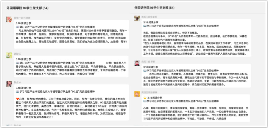 此外,为了营造支部线上学习氛围,各位党员同志还通过支部阅读日打卡活动,在党支部微信圈里纷纷分享了学习习近平总书记回信精神的心得体会。