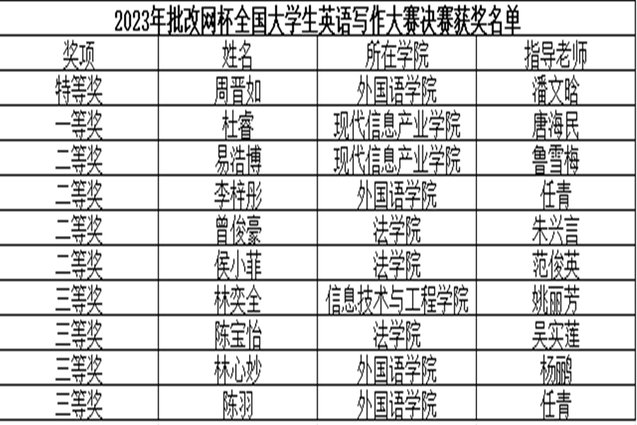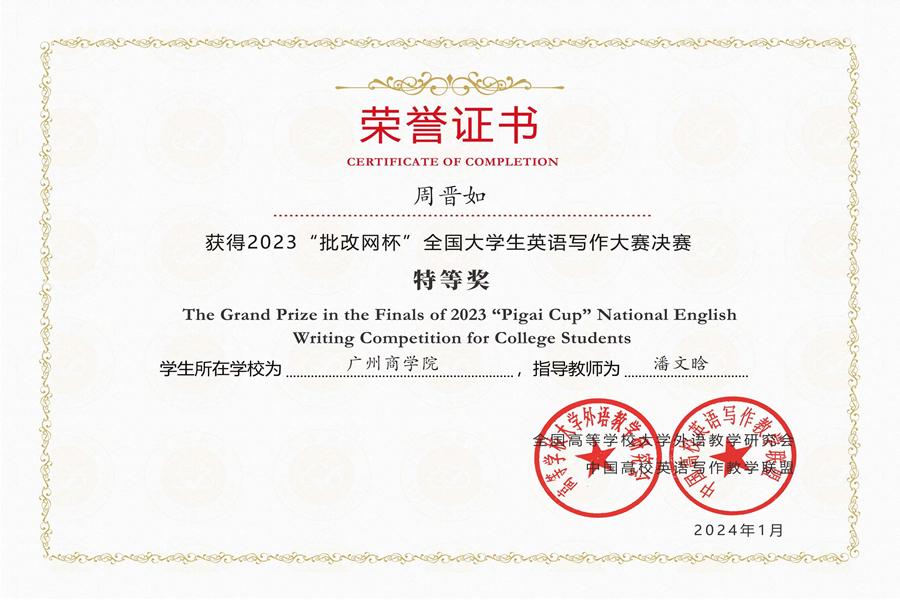 近日,在2023年“批改网杯”全国大学生英语写作大赛的全国决赛中,KY官网学子凭借沉稳的心理素质、良好的专业素质和强烈的责任担当勇夺优异的成绩,共获得1个特等奖,1个一等奖,4个二等奖和4个三等奖。KY开元集团官网教师范俊英、鲁雪梅、潘文晗、任青、唐海民、吴实莲、杨鹂、姚丽芳和朱兴言等老师获得“优秀指导老师”称号。