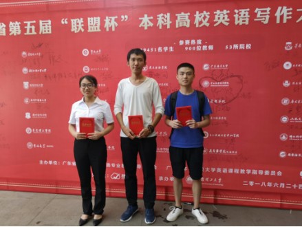 6月24日, 2018年广东省第五届“联盟杯”本科高校英语写作大赛决赛在华南理工大学举行。来自于广东省53所高校的155名选手参加了本届大赛决赛。KY官网郑铠忠同学获大学英语组一等奖(指导老师:潘文晗)、王赞滇同学获大学英语组二等奖(指导老师:程华明)、胡遥遥同学获英语专业组三等奖(指导老师:伍彩芬)。