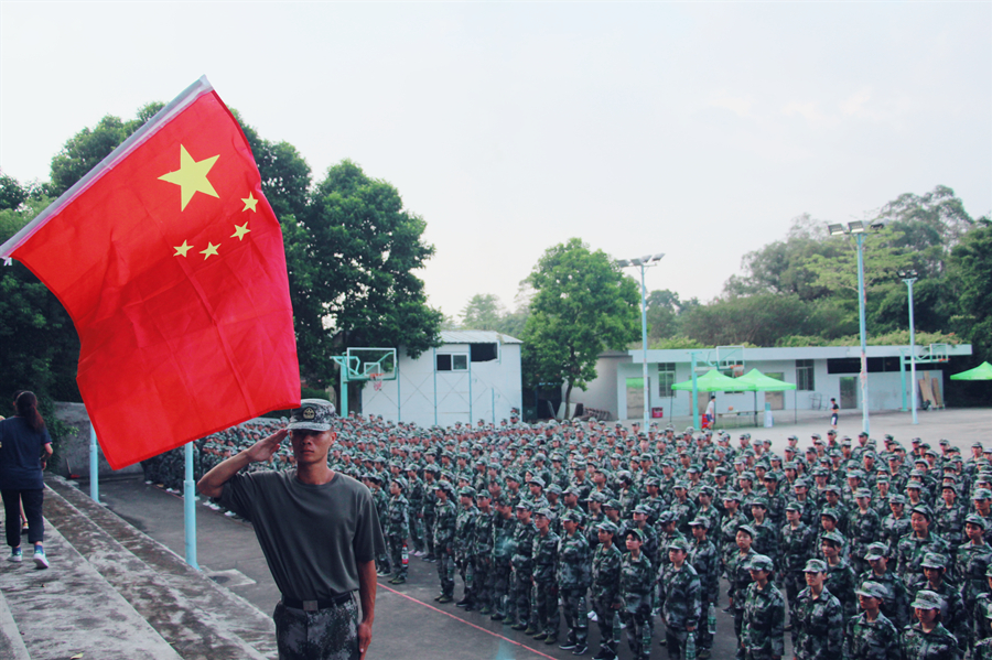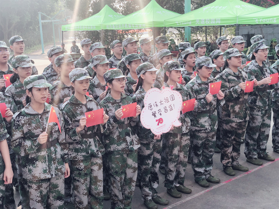 军事训练场上,在教官铿锵有力的口令声中迅速集结,全体师生统一面向国旗,在缓缓响起的音乐声中,大声高唱“起来!不愿做奴隶的人们!把我们的血肉筑成我们新的长城……”。高亢的国歌同唱,不仅唱出新生们为祖国母亲七十周年华诞致敬献礼的殷切呼声,也抒发对祖国母亲的无限热爱。随后,全体新生团员对着国旗行注目礼,时空定格在教官向国旗敬礼的一瞬,简单的动作,饱含的是广大青年不畏艰难,捍卫祖国荣耀,拥护共产党领导全国人民走向胜利的决心。紧接着不少新生结合自己的学习和生活,先后围绕“大学生应如何当好护旗手”发表了自己的想法和见解,抒发了深深的爱国荣校情怀。活动尾声,刘老师寄语全体新生要发扬艰苦奋斗的精神,担当起当代青年的神圣使命,把理想化为宏图,把计划付诸行动,展现风采,奉献智慧,与祖国共奋进,和祖国共拼搏,同祖国共进步。