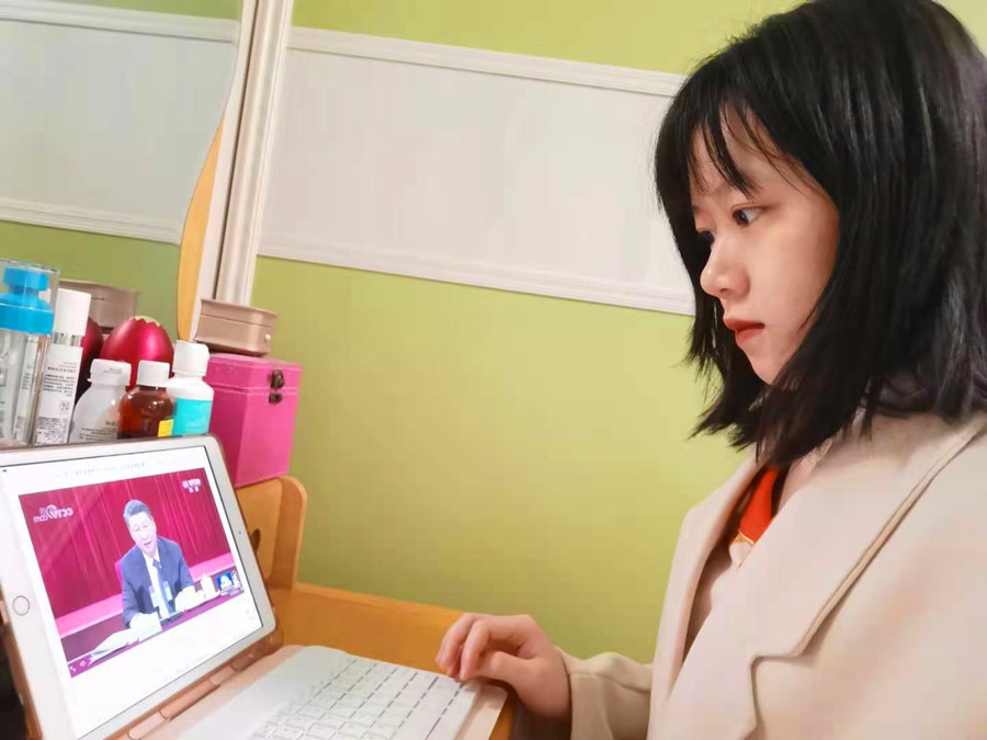 学院17级学生党支部学生党员蒋楚婷在认真聆听习近平总书记讲话