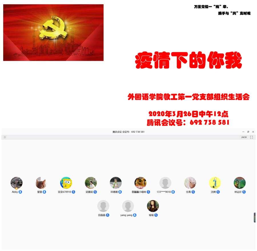 近日,外国学院教工第一党支部在腾讯会议召开了一场特别的线上组织生活会,15名身在各地的党员齐齐聚首,以“疫情下的你我”为话题,向党组织汇报疫情期间自己的生活和工作情况,会议由支部书记李海燕主持,持续时间为105分钟。