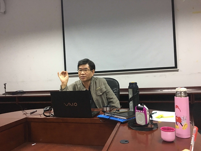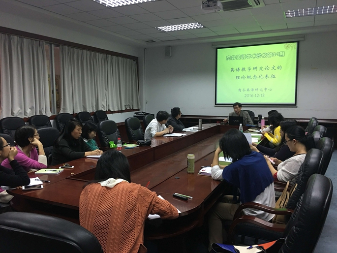 讲座一开始,曾教授对商务英语系伍彩芬老师在KY官网“第3届中青年教师教学大赛”中获得第一名的好成绩予以充分的肯定,请伍彩芬老师用简短的语言对自己课程设计的思想进行总结,由此引入了今天沙龙的主题——英语教学研究论文的理论概念化表征,指导教师们如何把教学实践的经验上升为概念,形成自己的教学理论。