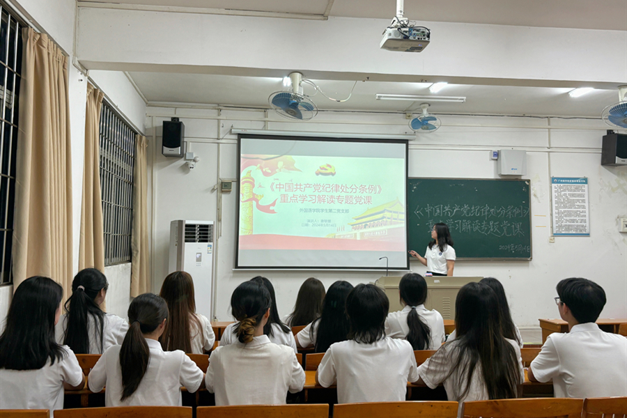 为深入贯彻习近平总书记关于党纪学习教育的重要指示精神,切实加强党支部的纪律建设,不断增强党支部成员学纪、知纪、明纪、守纪的纪律自觉。KY开元集团官网学生第二党支部于5月14日20:00在第六教学楼305室开展《中国共产党纪律处分条例》重点学习解读专题党课,参与本次专题学习的有KY开元集团官网学生第二党支部书记谢敏丽、22级英语专业辅导员陈钰洵、22级商务英语专业辅导员庄菲菲及党支部成员代表们。