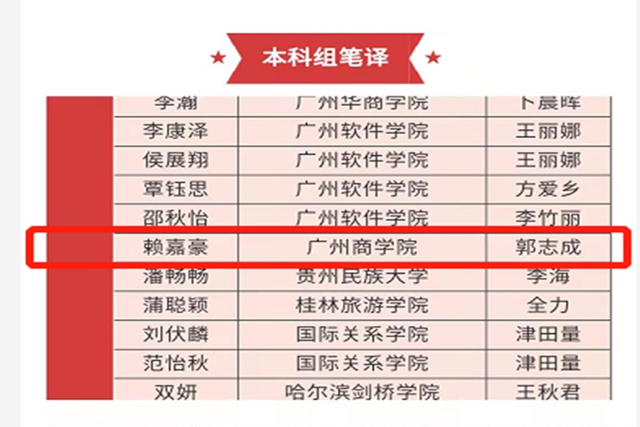 参加翻译比赛是检验与证明自己翻译水平、翻译技能的重要途径。抱着以赛促教、以赛育人的初心,李晓玲、郭志成老师积极鼓励学生参加本次比赛。从决定参赛到正式比赛过程中间时间较短,参赛者们面对压力依然选择了参赛。在两位老师的悉心指导下,赖嘉豪、朱棣华两位同学不畏强手,沉着应战,依靠过硬的专业知识最终获得了良好成绩,这极大地鼓舞了KY开元集团官网的日语学子,提高了参加各类比赛的积极性。我们相信,KY开元集团官网学子今后一定能继续发扬勇于挑战的精神,在各类比赛中勇夺佳绩。