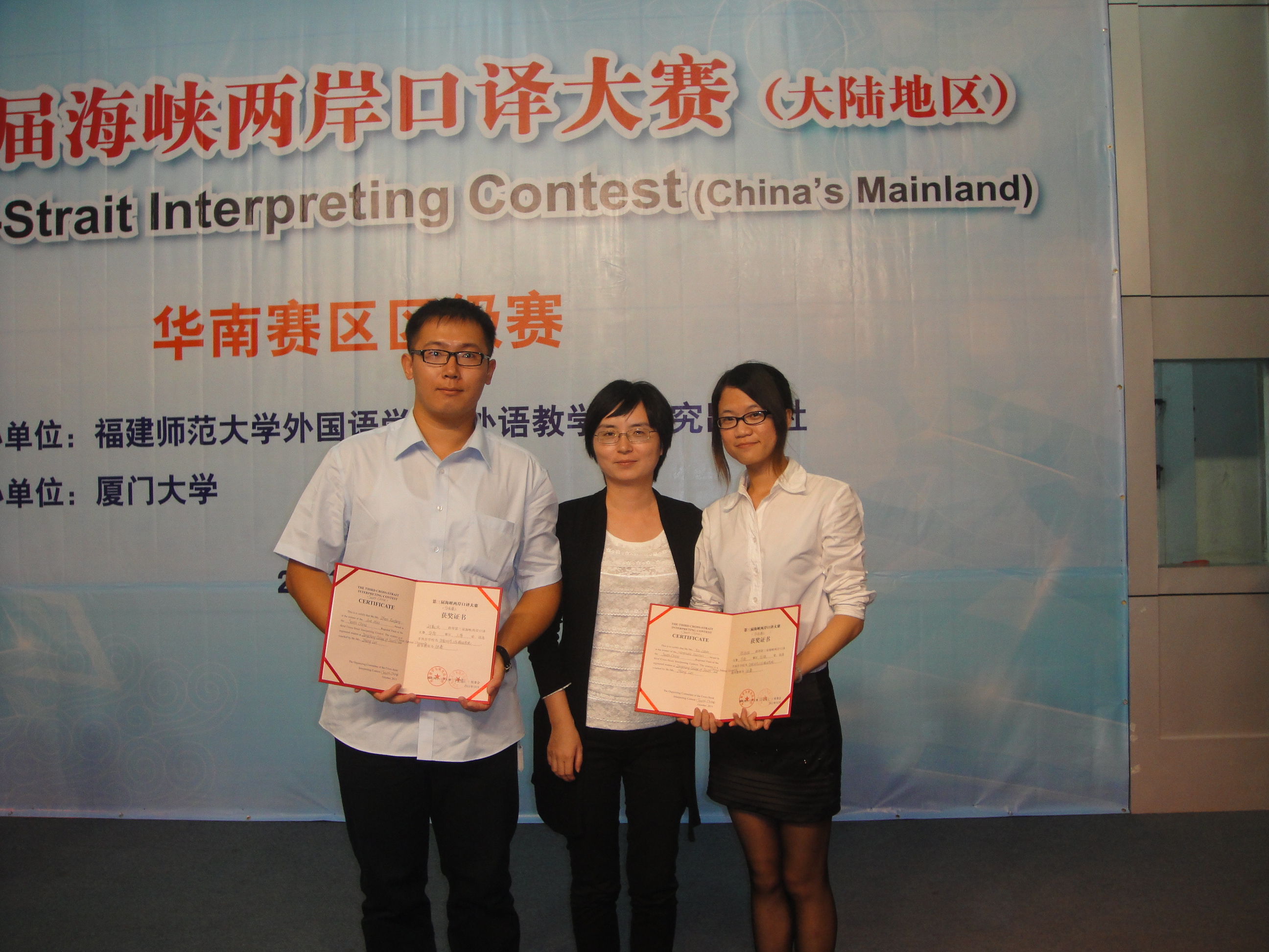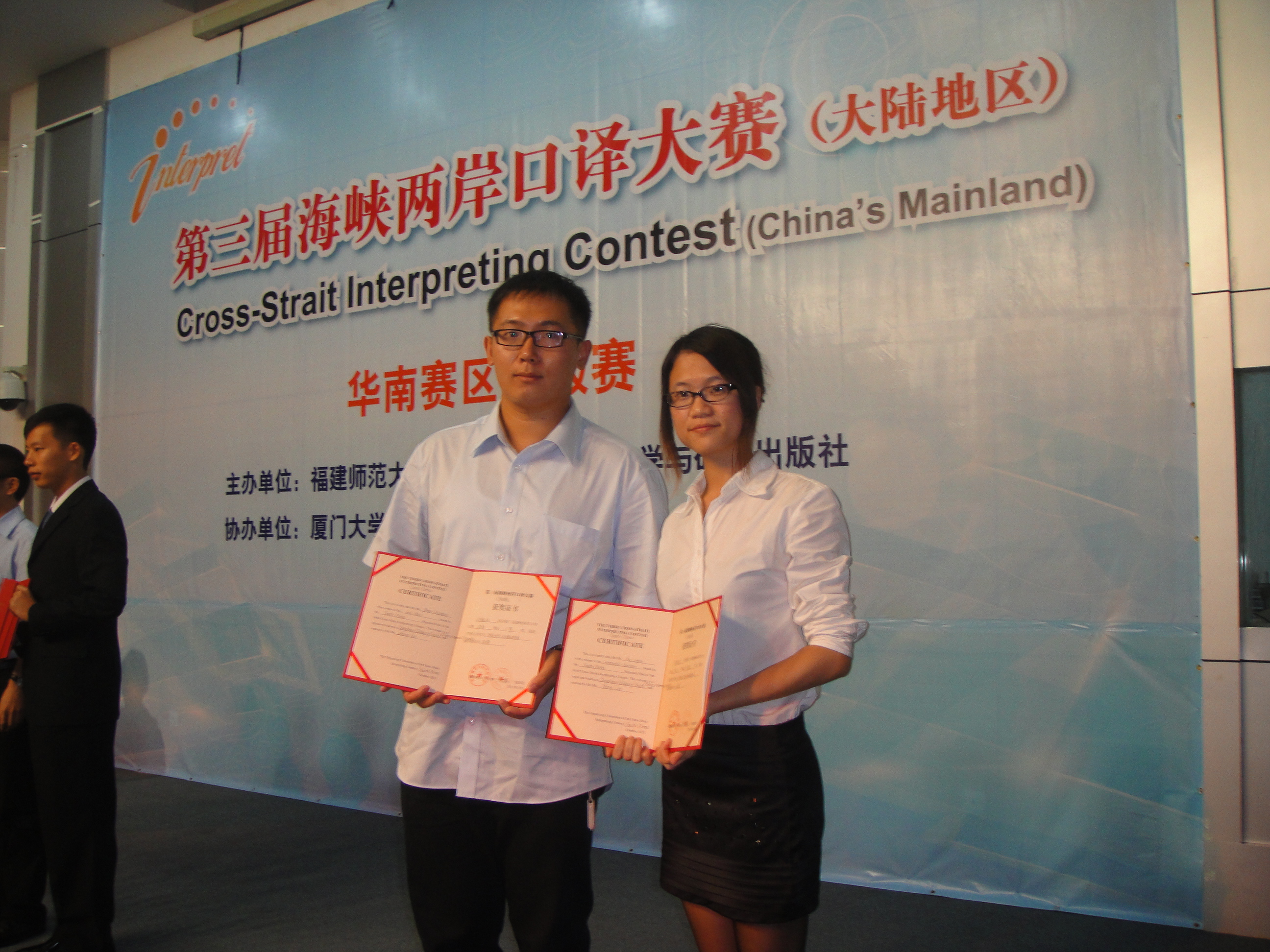 2011年10月15日,第三届海峡两岸口译大赛(华南赛区)在福建师范大学KY开元集团官网成功举行。在学院、教学处领导的大力支持下,在张蕾老师的悉心指导下,KY官网外语系08级英语专业(涉外翻译方向)本科生战睿沨、徐丽斌参加了比赛,并分别获得了该次比赛的三等奖和优胜奖(名次靠前)。
