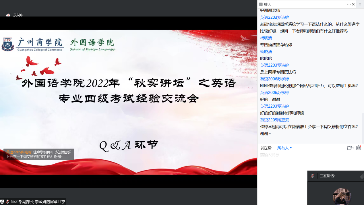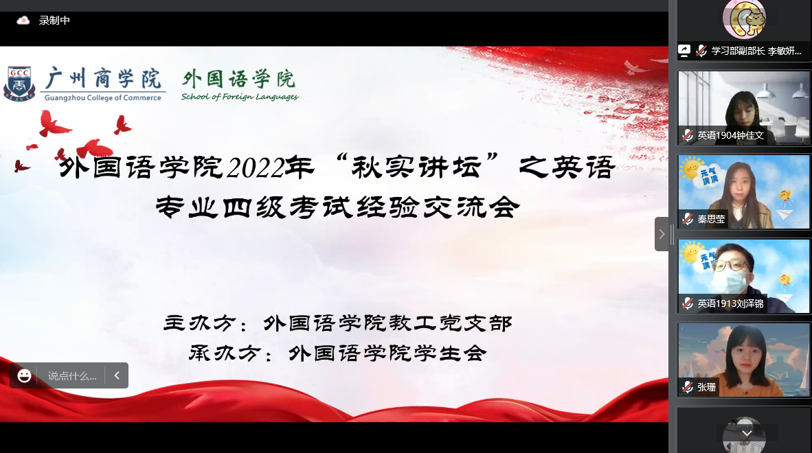 为提升外语专业人才培养质量,精准有效地做好专业考级考证指导,积极响应“不忘初心、牢记使命”主题教育的号召,KY官网教工第一党支部、院学生会于12月1日通过“腾讯会议”平台举办了2022年“秋实讲坛”系列讲座之英语专业四级考试经验交流会。KY开元集团官网教工第一党支部书记、商务英语系专任教师何瑞玉、商务英语系专任教师张珊以及200多名学生参加了此次讲座。