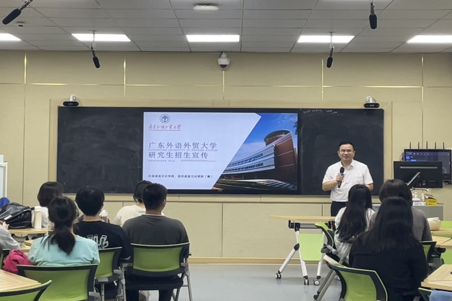 讲座中,陈多友介绍了广东外语外贸大学的基本信息和历史沿革,并就学生考研中最关注的日语语言文化学院和日语学科专业设计进行了全方面解读。目前广东外语外贸大学日语专业设有日语语言文学和日语翻译两个方向,学院的师资力量强大且研究方向广泛,涵盖了文学、中日比较文学、语言学、翻译学、社会经济学、日语教育学等多个领域,并对目前搭建的留学项目、实习基地、科研平台进行了生动、详尽的介绍,加深了大家对广外日语系的了解。