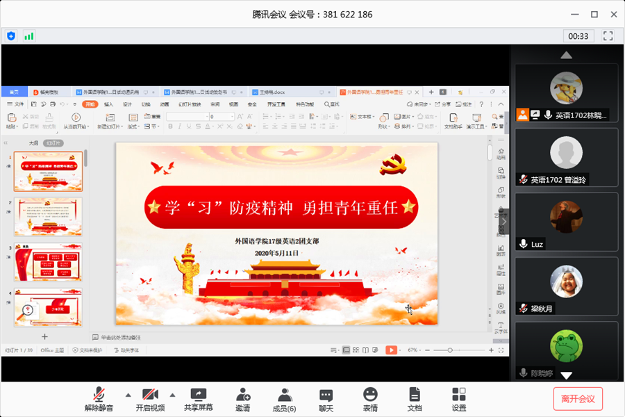 为深入学习宣传贯彻习近平总书记关于疫情防控工作的重要讲话和指示精神,认真贯彻落实习近平总书记给北京大学援鄂医疗队全体“90 后”党员的回信精神,激励广大青年弘扬五四精神,展现担当,KY开元集团官网17级英语2团支部于5月11日晚在腾讯会议召开了以“学‘习’防疫精神,勇担青年重任”为主题的“云”团日活动。班级结对子老师黄弢校长、班主任石佳老师、学院党总支徐超书记、校团委郑灿玲老师、辅导员刘丽老师出席活动,活动由团支书林晓莉主持。