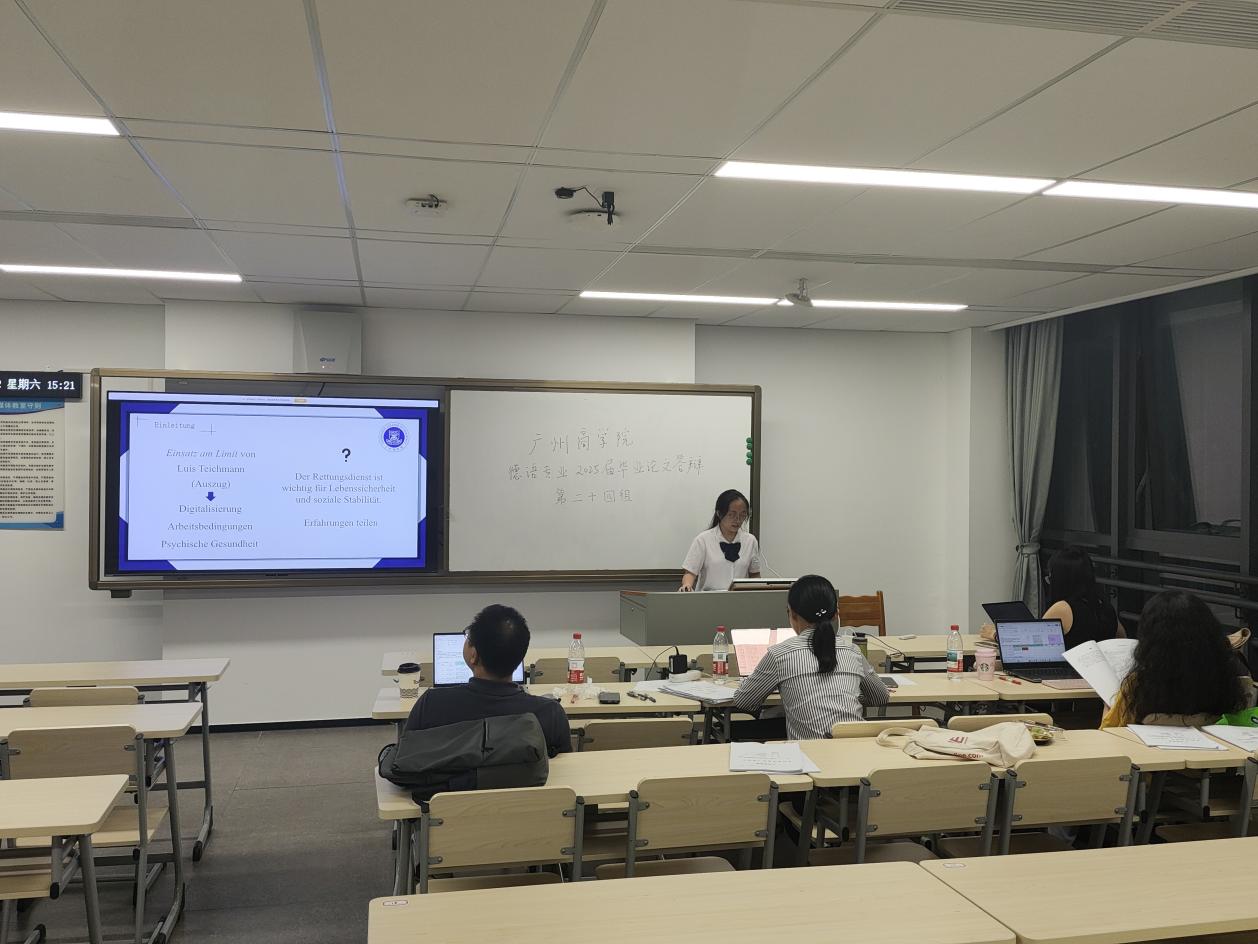 本届答辩工作呈现两大特色亮点:在组织架构方面,各答辩组配置“1+2+2”人员结构,即每组包含1名答辩组长、2名答辩成员及2名答辩秘书,形成多层次质量监控网络;在学术创新方面,英语类专业单设三个方向优秀组,德语、日语专业分别设立优秀论文答辩专场。答辩全程采用目标语进行,学生通过多媒体可视化呈现研究成果,接受答辩评审老师们质询时需即时进行学术观点阐释。