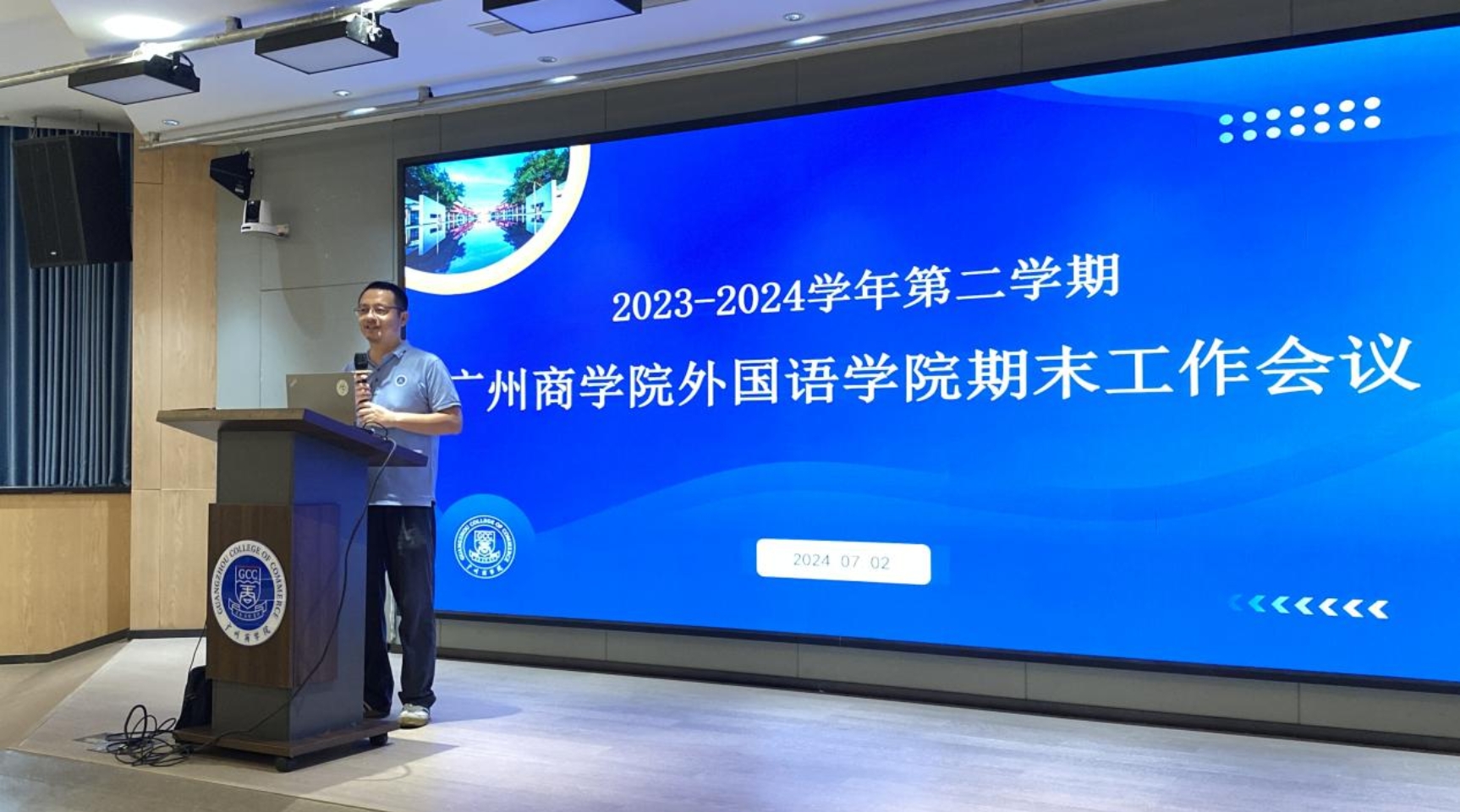袁鑫在一流课程、教学比赛、毕业论文、期末工作、外语专业发展危机等五个方面进行总结汇报。袁鑫指出,学院本学期教学常规工作稳中有进,教师参与教学比赛比例创历史新高,科研工作取得新突破,其中有4个校级一流课程获学校审批,1个省级课程获得立项。今年上半年学院所有毕业论文均通过上级抽检,袁鑫希望在保证毕业论文通过率的基础上,需更注重质量,多发挥学生主观能动性。