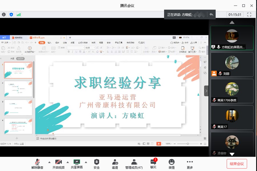 随后,方晓虹同学首先讲解了求职面试的技巧——认识自己,找到方向;包装自己,展示自我;真诚交流,把握缘分。方晓虹指出如果同学们有意愿从事跨境电商类行业的工作,应该要提前熟悉了解国内外的跨境电商平台有哪些,在心里有一个大概的意向名单,对自己的意向单位加深了解,做到心中有数。她还同时向同学们分享了自己的就业观——先就业,后择业。最后她向同学们分享了可靠的求职渠道,包括智联招聘网站和广东省大学生就业创业公众号等,鼓励同学们不要仅仅停留在观望阶段,遇到自己意向的岗位,一定要积极的投递简历。