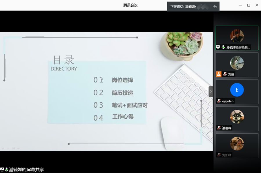 首先,潘毓婵同学结合自身的求职经历以及自己的理解体会,主要从岗位选择、简历投递、笔试+面试应对和工作心得四个方面进行阐述。她详细的介绍了校园招聘的准备工作,指出同学们应该在校招前做好充足的准备并且根据自身的兴趣、能力投递合适的岗位,同时简要介绍了自己电商客服类的工作日常内容。最后潘毓婵同学结合自身工作心得,向同学们强调了工作中虚心学习以及进行职业规划的重要性。