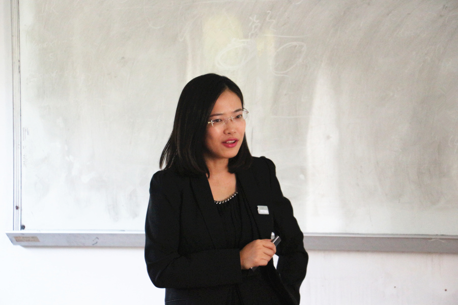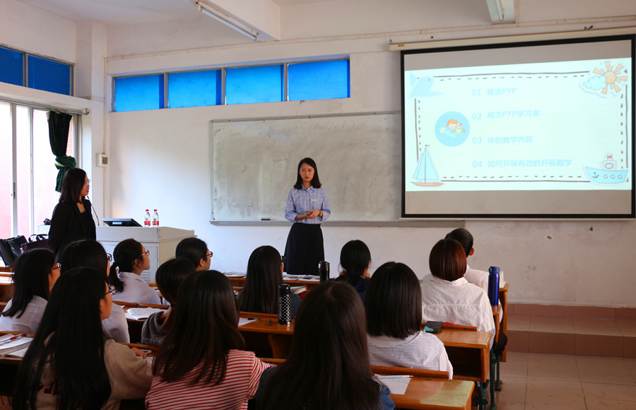 易光蓉经理首先向在场的师生简单介绍了侨鑫集团及汇悦天啟幼儿园的基本概况,随后介绍了International Baccalaureate(下文简称IB)这个非盈利性的教育基金会,IB作为跨国家的教育体系,在全球深受欢迎,其官方教学语言包括英语、法语和西班牙语,汇悦天啟幼儿园的教育培养体系主要源自IB,故在幼儿园任教的教师均为外语专业毕业,而且语言水平均有很高要求。