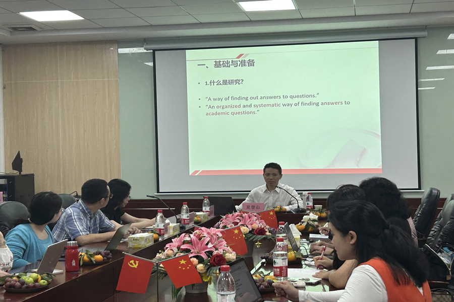 在具体构思和写作过程中,夏登山教授提出“结构要素分析法”,建议老师们要重点理解论文结构的内在学术逻辑。他通过“解剖麻雀”的方法分析了几篇语言学和翻译研究的论文,生动形象地展现了学术论文各个部分的基本结构要点。夏登山教授的实例展示和实用建议使讲座更具操作性,为在场的教师提供了清晰的写作指引。