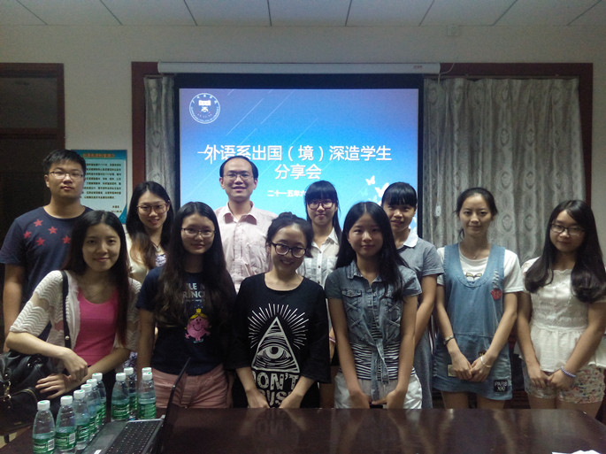 为拓宽学生的国际视野,提供学生出国(境)深造的指导与服务,6月12日15:00,外语系在第二行政楼307办公室举行了出国(境)深造学生经验分享会。外语系2015届优秀毕业生陈梦桑(澳洲新南威尔士大学口译专业研究生)和韩媛媛(香港大学翻译专业研究生)分享了她们申请出国(境)深造的心得体会。外语系党总支书记徐超和12级辅导员黄玉亭出席本次分享会。