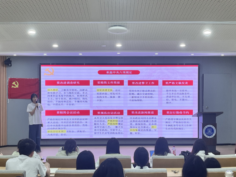 专题学习结束后,陈丽珊进行总结发言。她充分肯定了梁顺同学的讲解方式,强调中央八项规定精神不仅是党员干部的行为准则,更是新时代青年学子应当坚守的价值规范。她向在场入党积极分子提出三点希望,一是要坚定理想信念,做到对党忠诚、知行合一;二是要保持终身学习态度,主动适应时代发展需求;三是要弘扬艰苦奋斗精神,在涉外就业环境中不断提升核心竞争力。她指出,青年党员要将专业能力主动融入国家发展大局,通过务实文风、扎实作风展现青年担当。