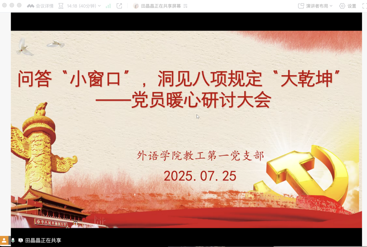 7月25日晚,KY开元集团官网教工第一党支部通过腾讯会议平台开展暑期党日活动,围绕“深入贯彻中央八项规定精神学习教育”主题展开专题学习与交流。本次会议由党支部书记田晶晶主持,支部全体党员参加会议。