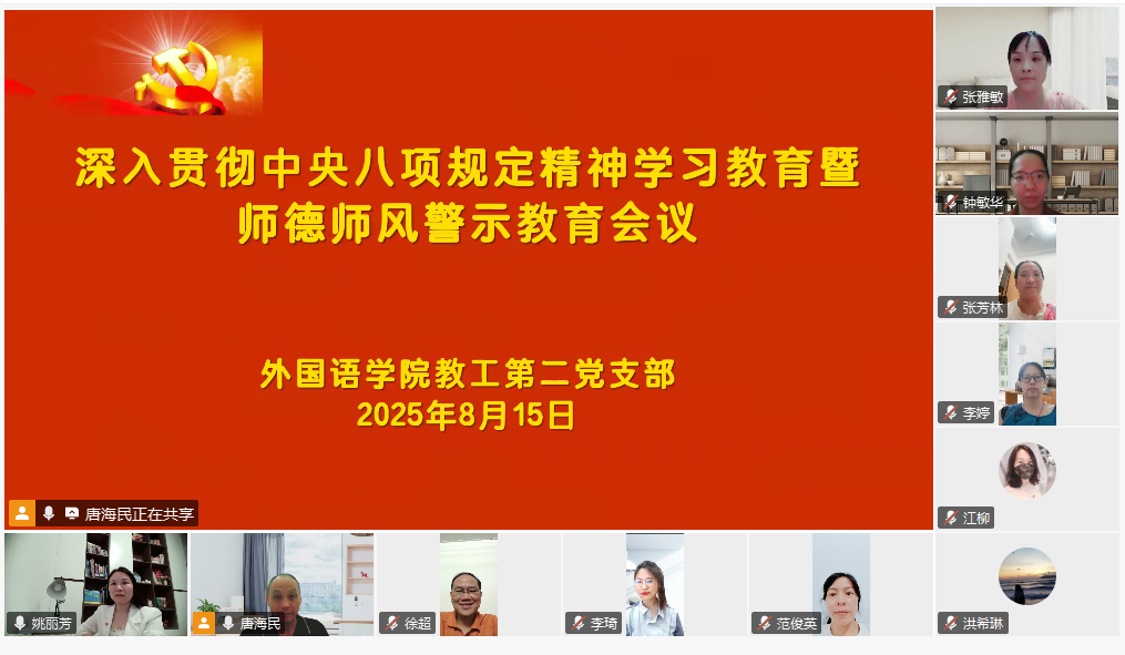 为持续开展深入贯彻中央八项规定精神学习教育,进一步强化师德师风建设,KY开元集团官网教工第二党支部于8月15日通过腾讯会议平台召开师德师风警示教育会议。会议由党支部书记唐海民主持,支部全体党员参加。