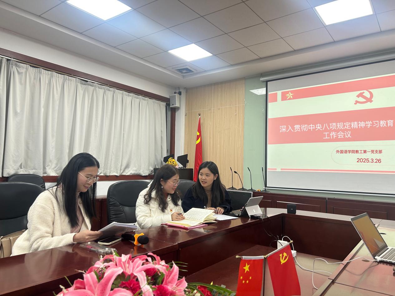 为深入贯彻中央八项规定精神学习教育,田晶晶与两位支委专题讨论如何在教工党员中开展学习教育,并对学习教育内容和心得体会撰写提出了明确要求。根据党支部实际,田晶晶作出以下四个方面的动员工作部署:(一)深化理论武装,筑牢思想根基;(二)强化师德师风建设,赋能课程思政育人;(三)加强警示教育观影,增强纪律敬畏意识;(四)全面反思查摆问题,精准纠治难堵点。其中,理论学习是先导,