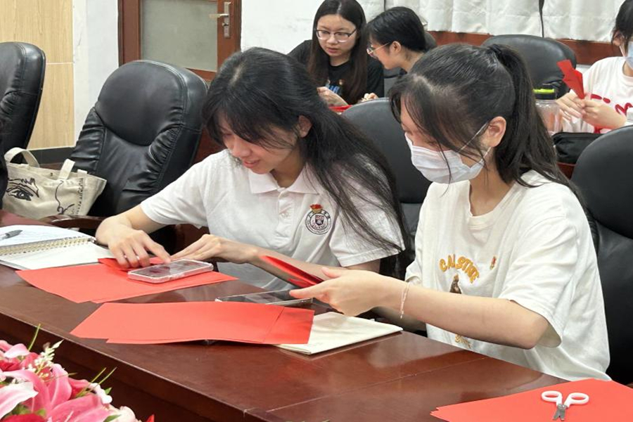 活动中,蔡文蝶观察每一位学生党员的剪纸进展,予以耐心指导,同时鼓励学生党员们大胆创新,创作富有个性的红色剪纸作品。党员们发挥想象力与创新力,创作出了“红心向党”“我爱我党”“小小红船”等剪纸作品。